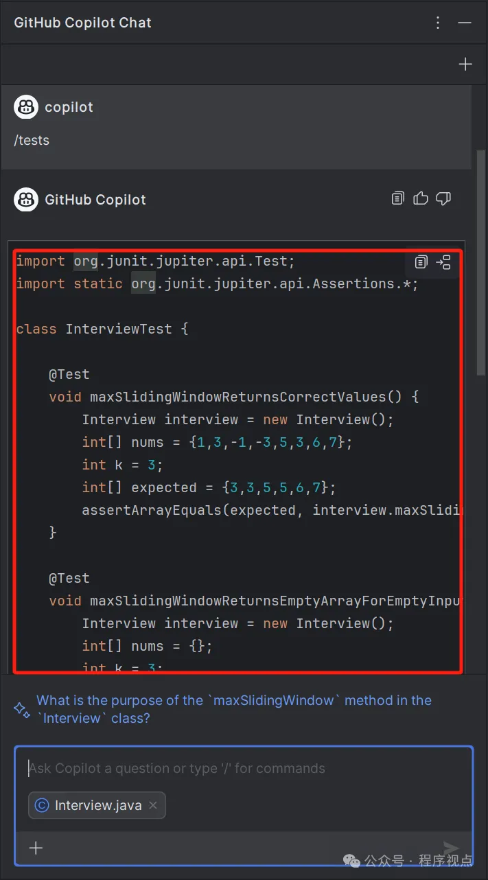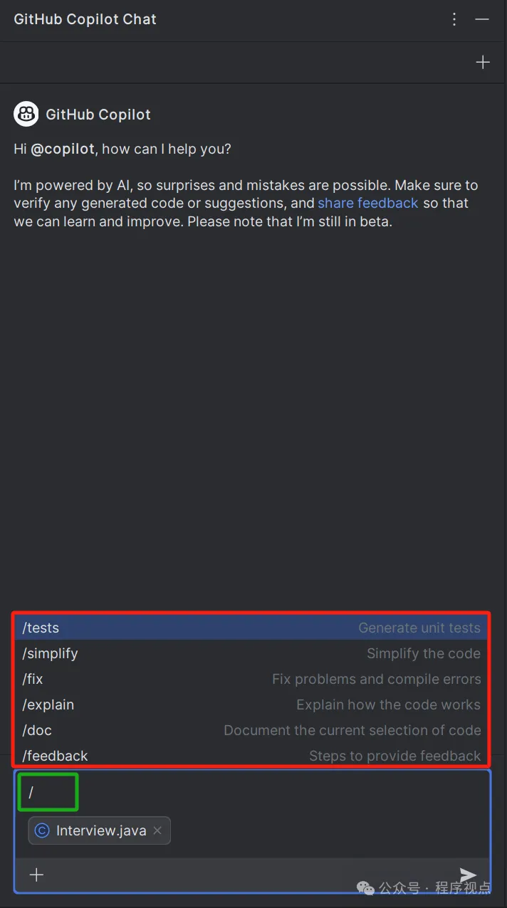 然后会自动弹出GitHub Copilot Chat窗口。输入框中就附带有当前要测试的文件了。再输入/,就有一堆上拉提示,如/tests,/simplify,/fix,explain等指令。