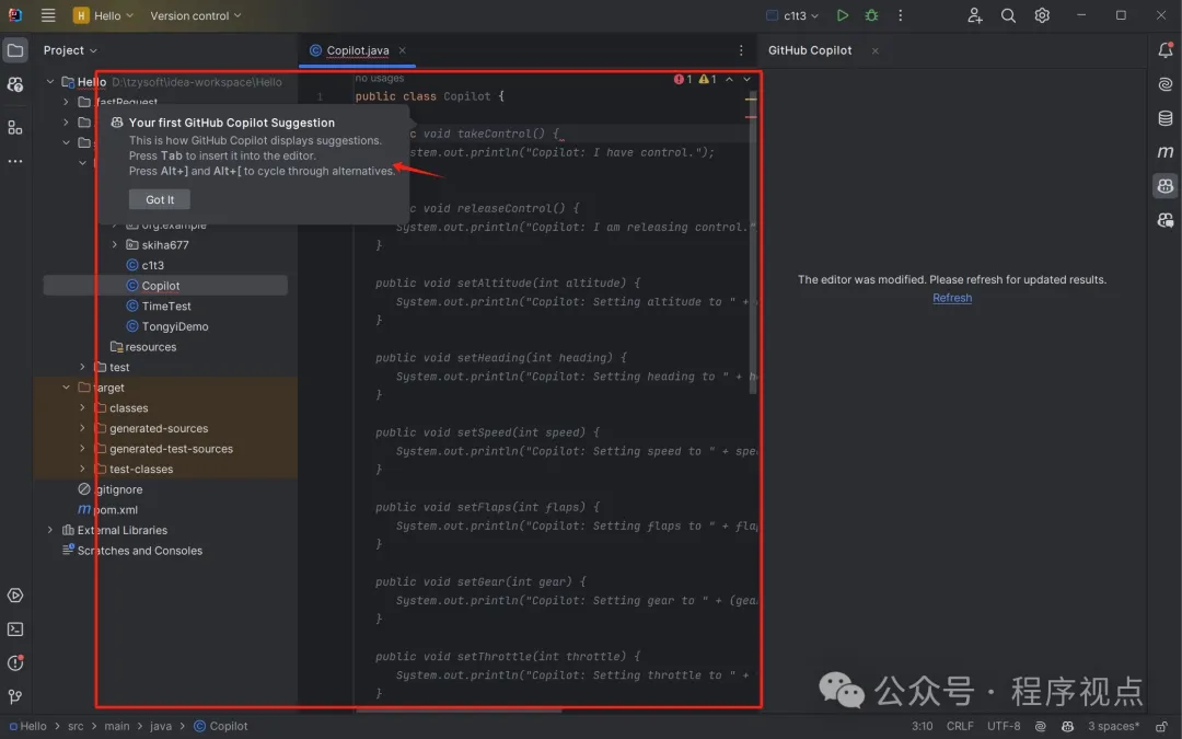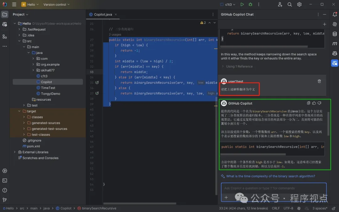 但这里我要说明一点。我们看到GitHub Copilot在回答时,用来标号1,那是不是说还有其他的(我们知道读写文件的方法很多的哦~)。于是我按Tab接受他的建议,再回车...