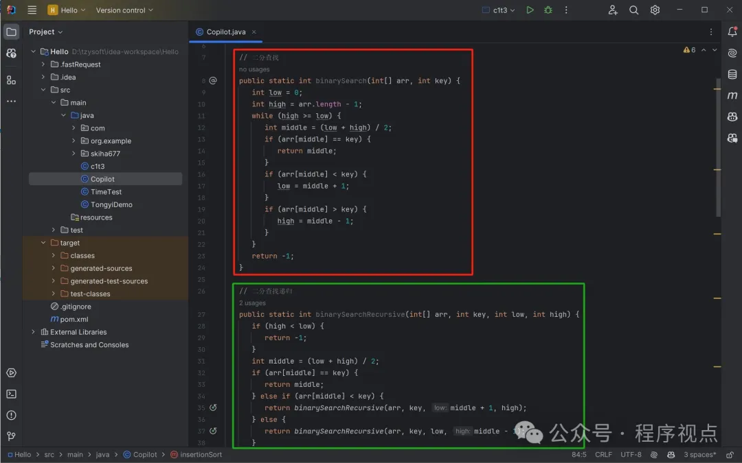 输入”//二分查找“。咦!没有反应!(其实按”回车“键就有反应的) 这里主要演示下面图右框的功能。