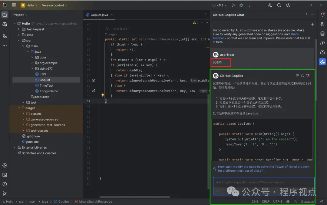 另一种情况:有的小伙伴是新入手编程,要提高自己编码的技能,不希望GitHub Copilot给代码,而是给方向,比如什么功能用什么方法实现、某个方法怎么用等等。