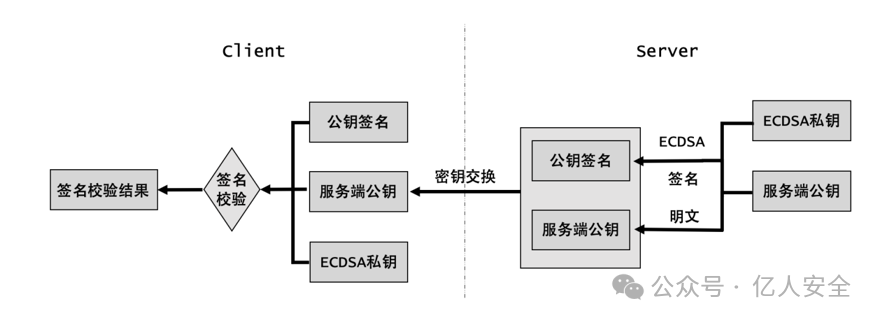 对服务端下发到客户端的公钥使用非对称的 ECDSA 算法进行签名,客户端使用预埋的公钥进行验签,具体校验流程如图 3 所示。