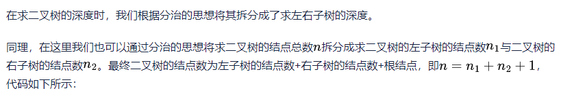 当我们求叶结点的数量时,我们同样也可以通过分治的思想来进行求解。要求一棵二叉树的叶结点数量,我们可以将其拆分成求其左右子树中的叶结点数量,对应代码如下所示: