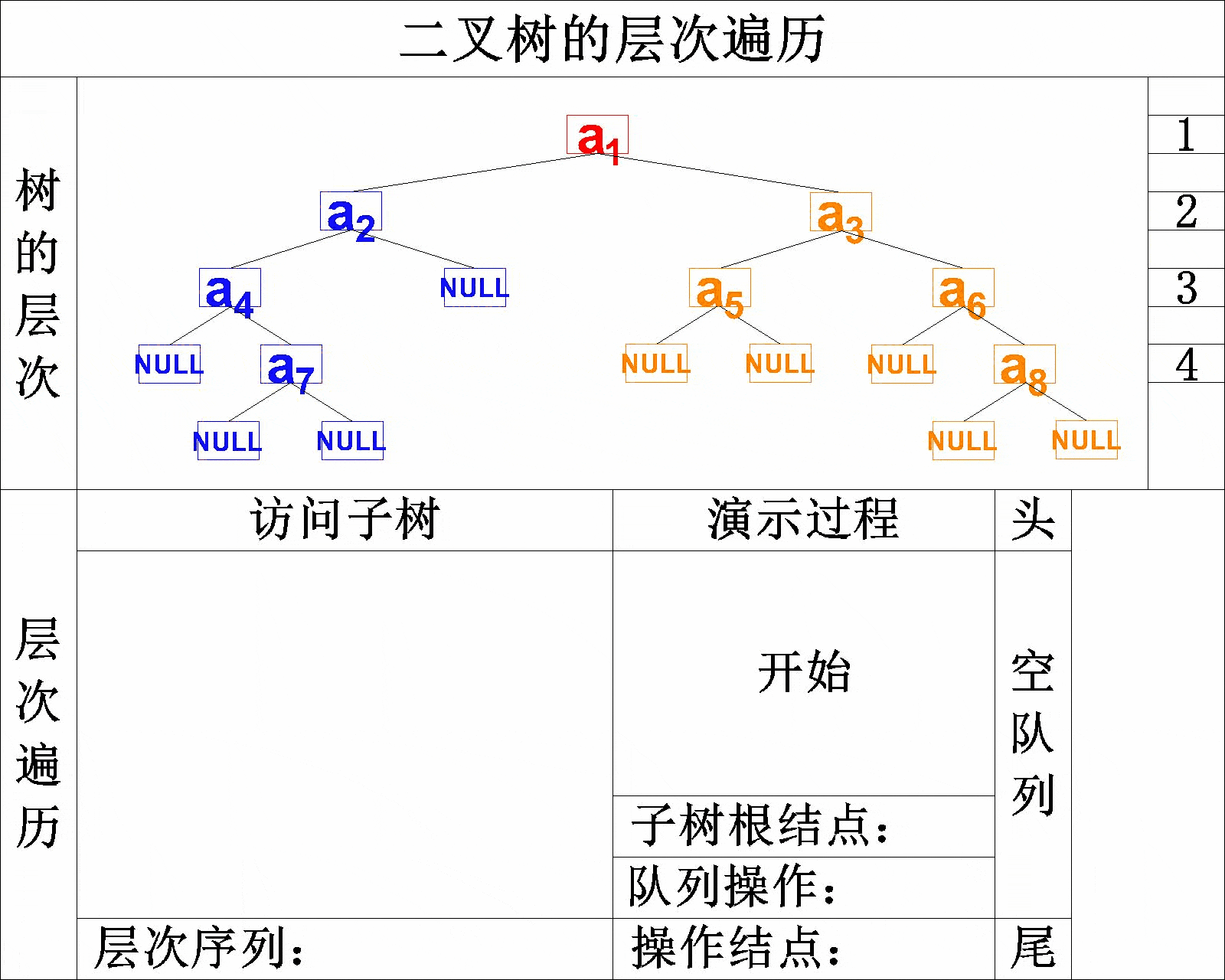 InitQueue(&Q);//初始化链队列在完成队列的初始化后,我们需要先将二叉树的根结点进行入队,在后续的遍历过程中我们同样是借助临时指针p来完成二叉树的遍历: