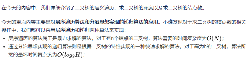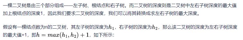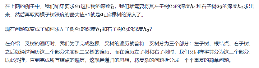 }可以看到当我们在求二叉树的深度时,我们将其拆分成了求左子树的深度和右子树的深度,这种将问题拆分的思路是算法中的分治思想,目前我们先简单的了解一下,在后面的内容中我们会再进一步介绍该内容。