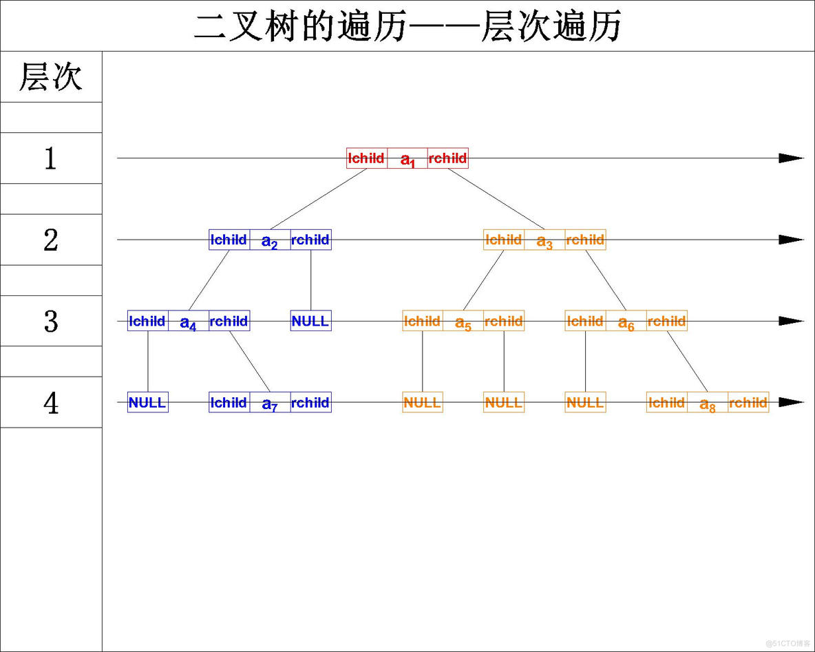 //BTL——二叉链表的类型对于二叉树的层次遍历,这里我们主要介绍的是第二种思路——通过队列实现二叉树的层序遍历。因此我们还需要定义一个能够存储二叉树的结点的队列,队列的数据类型如下所示: