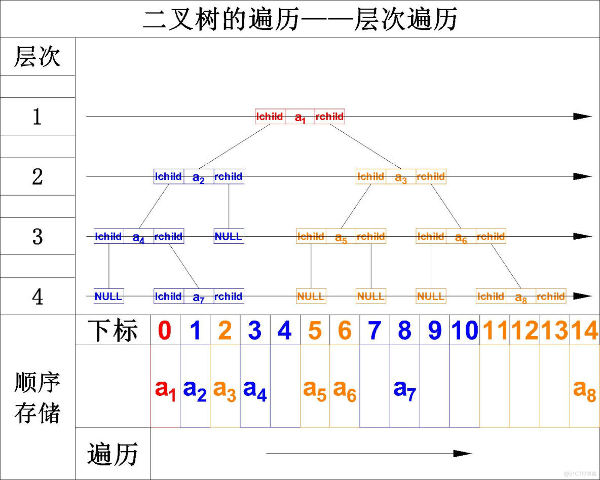 在二叉树的顺序存储中结点就是按照层次依次存入数组,因此顺序存储是可以实现二叉树的层次遍历的。但是顺序存储在前面我们也讨论过,它更适合于满二叉树和完全二叉树,对于如上图这种一般的二叉树而言,很容易造成空间的浪费。