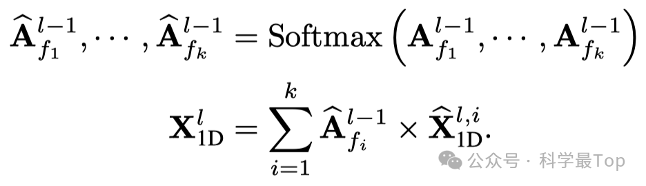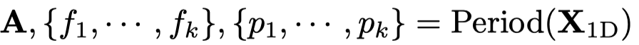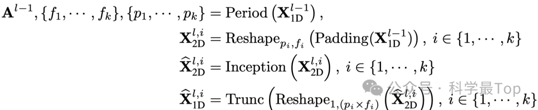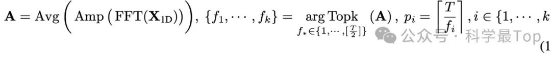 FFT(·) 和 Amp(·) 分别表示快速傅里叶变换和振幅值的计算。A ∈ R^T 表示从C个维度上平均得到的每个频率的振幅。作者只选择前k个振幅值,并获得具有非归一化振幅的{A_f1, ..., A_fk}的最显著频率{f1, ..., fk},其中k是超参数。这些选择的频率也对应于k个周期长度{p1, ..., pk}。上述过程总结如下: