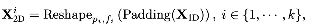 Padding(·) 是沿着时间维度用零来扩展时间序列,以使其与 Reshape_{p_i, f_i}(·) 兼容,其中 p_i 和 f_i 分别表示转换后的二维张量的行数和列数。