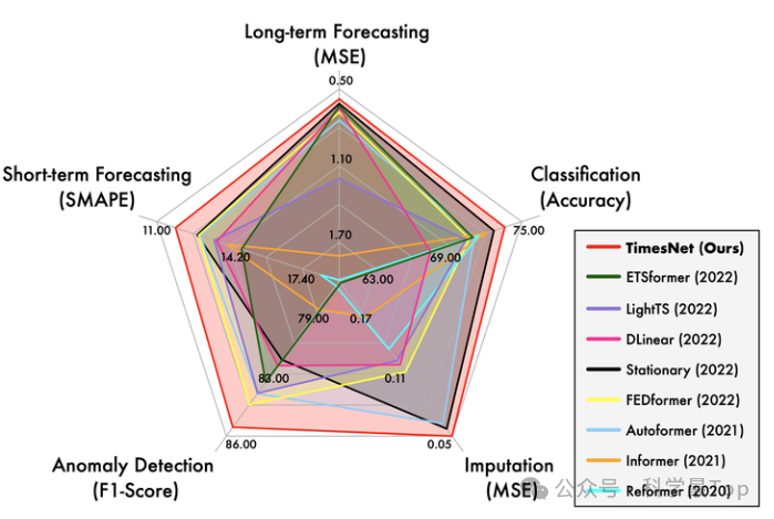 在长时、短时预测、缺失值填补、异常检测、分类五大任务上实现了全面领先。我看知乎对文章的讨论比较激烈,但作者比较耐心的对提出的疑问进行了解答,个人感觉学习解决问题的思路还是非常值得阅读的。另外在写作方面,文章可视化做的非常好,下面的雷达图我已经不止一次看到了。