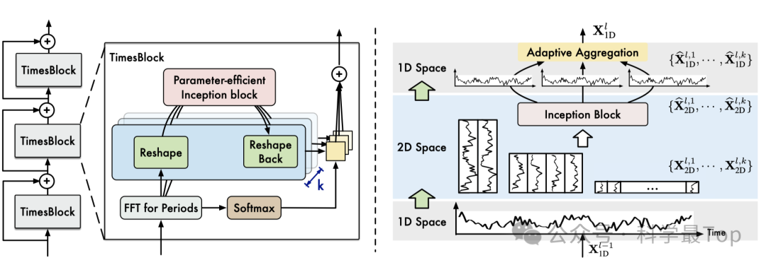 如图3所示,对于第l个TimesBlock,整个过程包括两个连续的部分:捕获时间二维变化模式以及自适应地聚合不同周期下的表示。