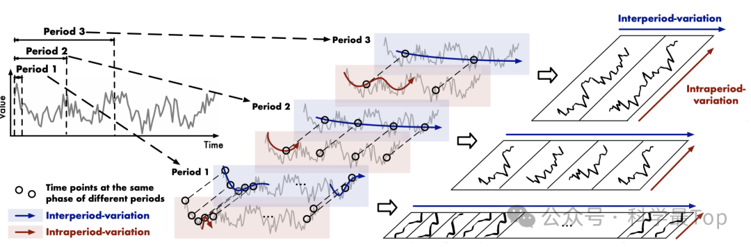 基本观察:如图所示,现实世界中的时间序列通常表现出多周期性,例如天气观测中的日变化和年变化,以及电力消耗中的周变化和季变化。每个时间点的变化不仅受到其相邻区域时间模式的影响,而且与其相邻周期的变化密切相关。作者称之为周期内变化(intraperiod-variation)和周期间变化(interperiod-variation)。前者表示一个周期内的短期时间模式,而后者可以反映连续不同周期的长期趋势。