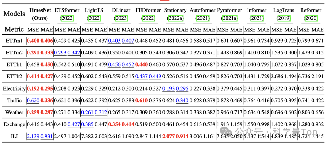 这样的好处在于可以利用二维卷积核对这些二维张量进行建模,从而提取出时间序列中更深层次的时间变化特征。基于TimesNet框架,可以自适应地发现时间序列中的多周期性特征,并从转换后的二维张量中提取复杂的时间变化。在五个主流时间序列分析任务中的卓越性能,包括短期和长期预测、插补、分类和异常检测等。与现有方法相比,TimesNet展现出了更高的准确性和稳定性,证明了其在通用时间序列分析中的有效性和通用性。