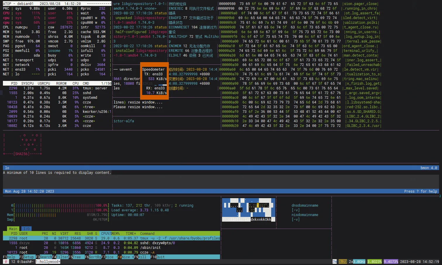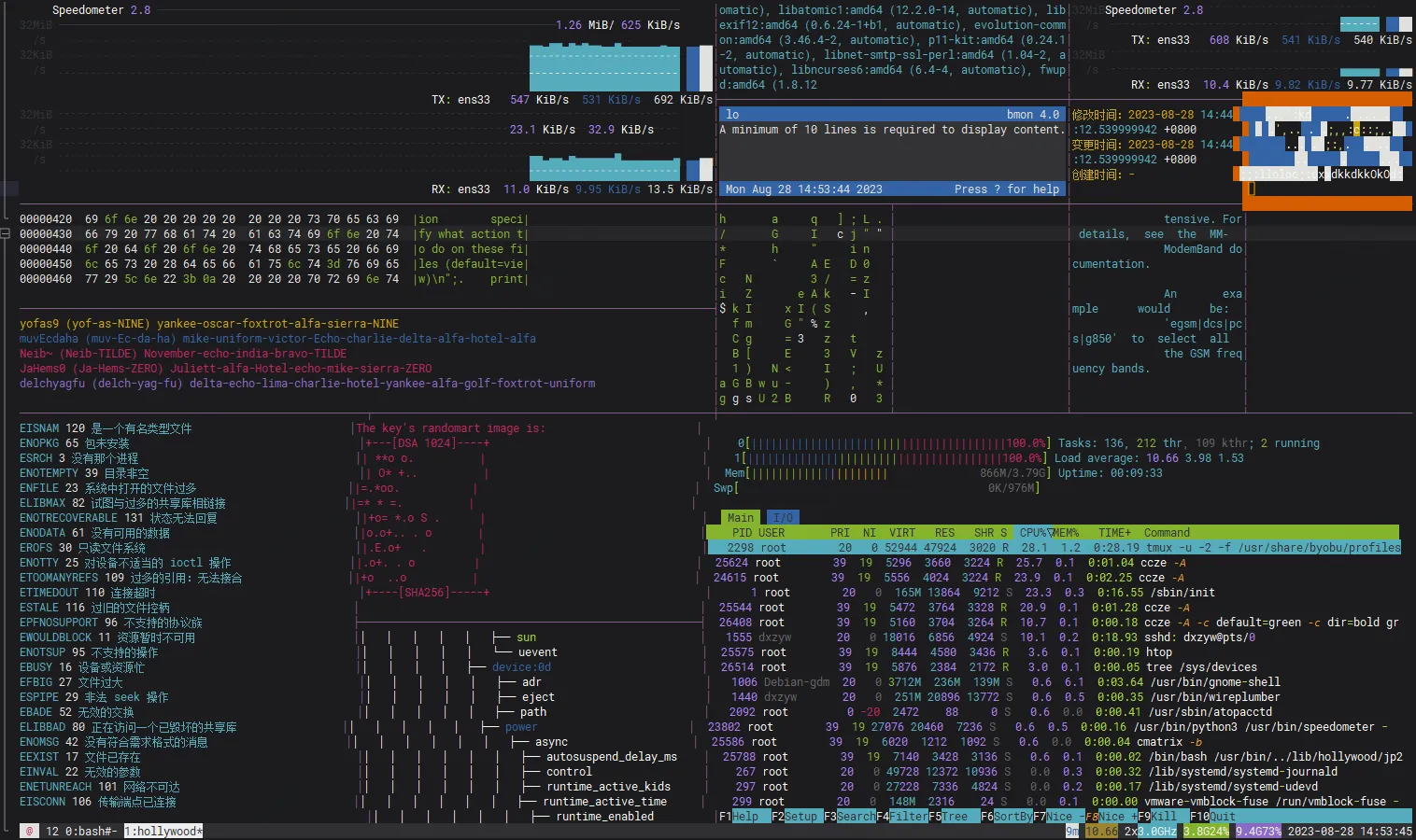 apt install -y hollywood综上所述,这段内容进一步展示了 hollywood 在系统监控方面的强大用法,可以创建出极具个性化和艺术感的命令行动画效果。