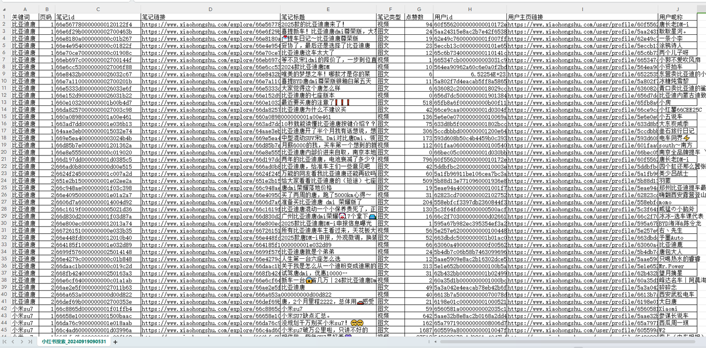 10. 笔记csv含10个字段,有:关键词,页码,笔记id,笔记链接,笔记标题,笔记类型,点赞数,用户id,用户主页链接,用户昵称。