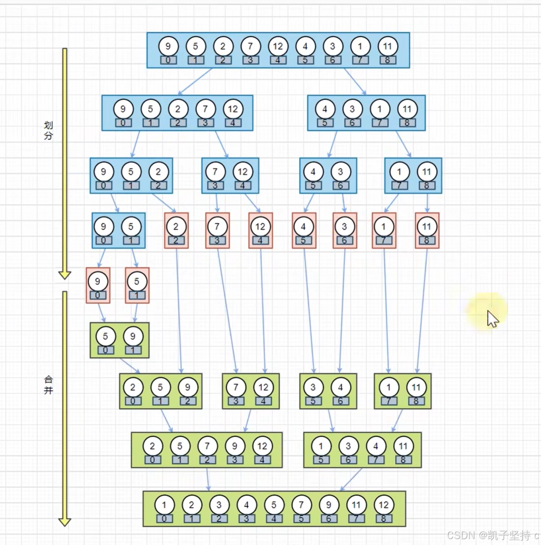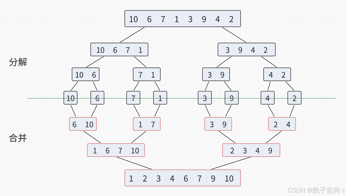 归并排序是从中间位置划分,两两一排序,相对位置是不会发生变化的