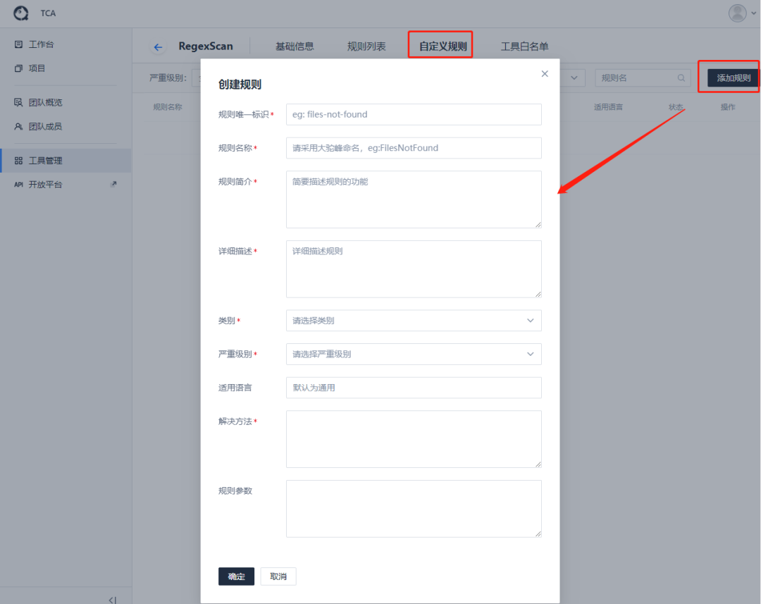 进入工具管理页面,找到正则工具RegexScan,并点击进入自定义规则列表页,点击添加规则按钮。