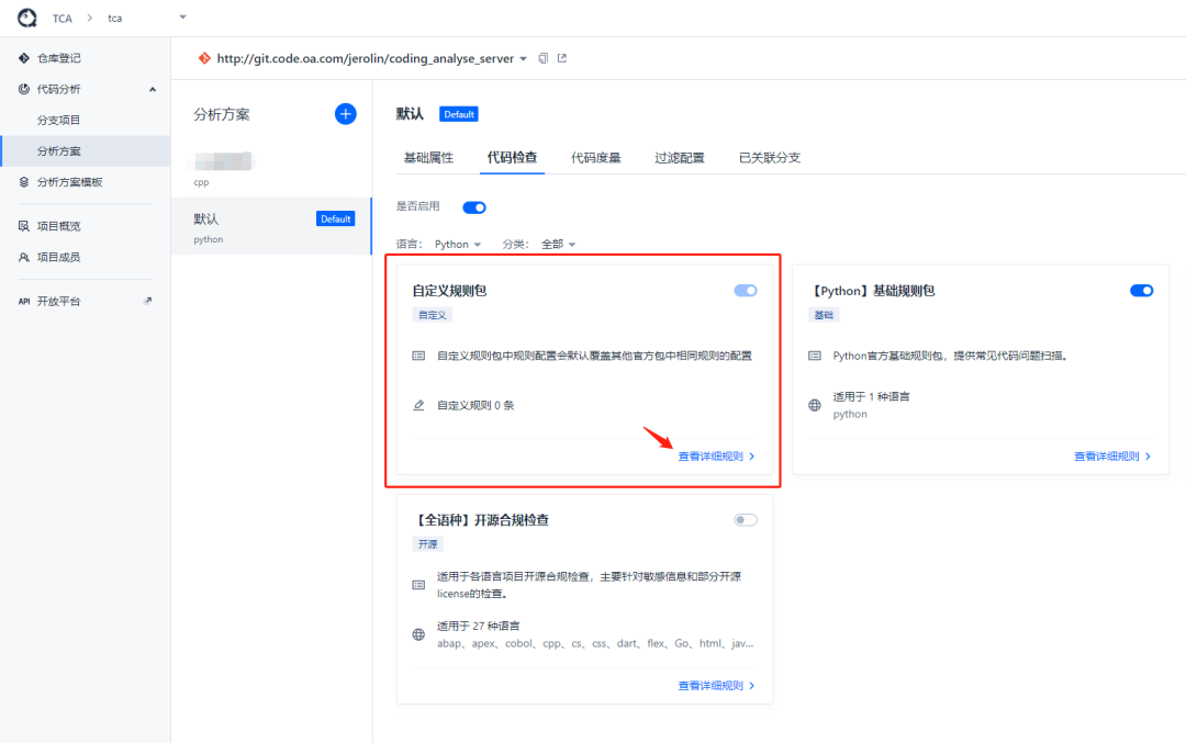 添加完成,可在分析方案-代码检查-自定义规则包-添加规则。