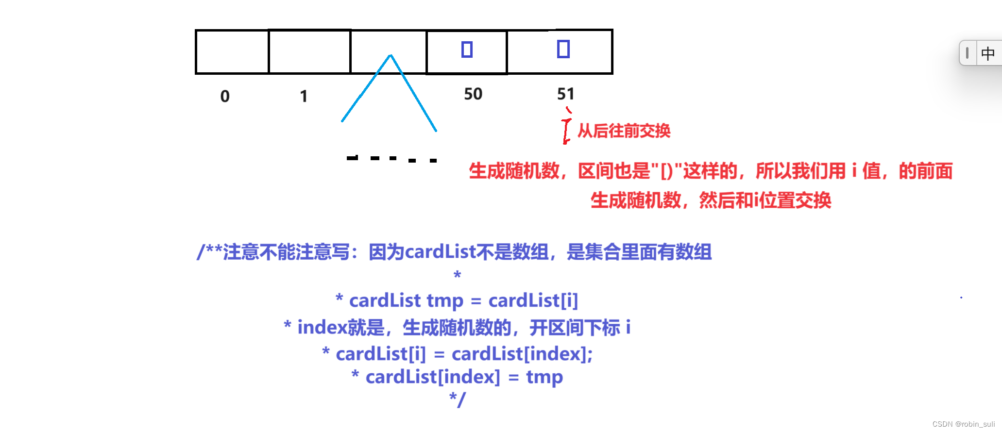}(2)洗牌:这里巧妙,利用生产随机数,这里也要注意,交换牌时的Swap方法,通过集合来交换,会有一个开区间下标,不在生成随机数的范围内,通过这来打乱牌,我画了一个图来理解: