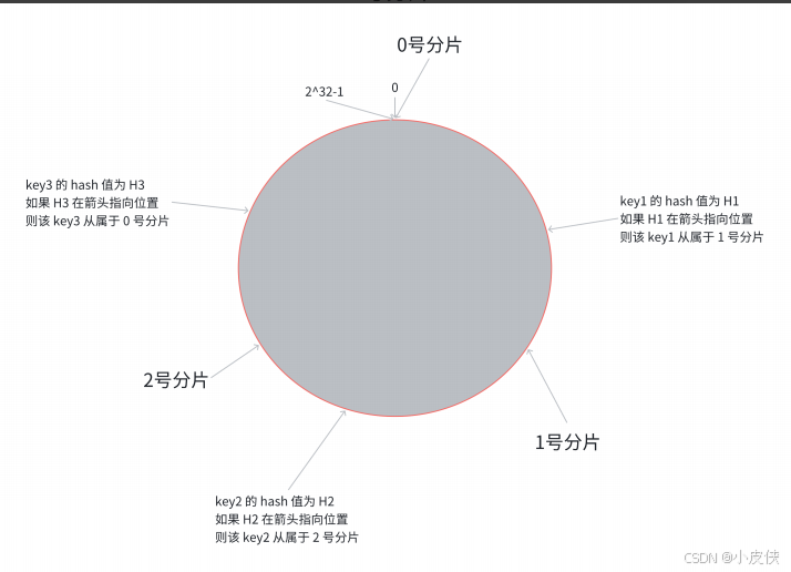 这就相当于, N 个分⽚的位置, 把整个圆环分成了 N 个管辖区间. Key 的 hash 值落在某个区间内, 就归对应区间管理.