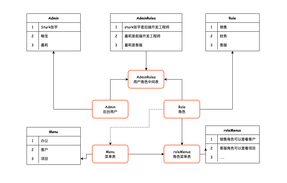 RBAC的数据库设计最主要的记录就是以下5个数据表实现,重点叙述一下用户角色关系表 admin_roles,把用户stark张宇设置成为多个角色,是一个多对多的关系,在操作数据时使用事务操作,来保证数据的原子性和一致性,系统中设置先设置菜单,生成菜单的节点,对角色直接操作,不作用在用户上,用角色分离后台用户和权限。