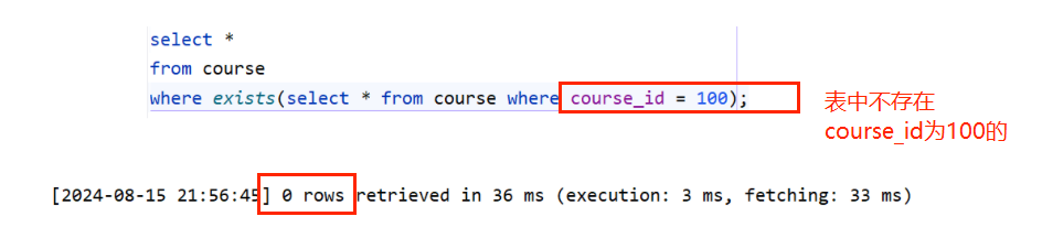 where exists(select * from course where course_id = 100);