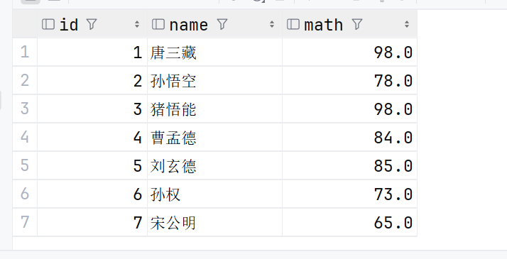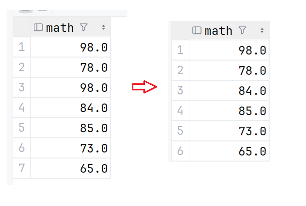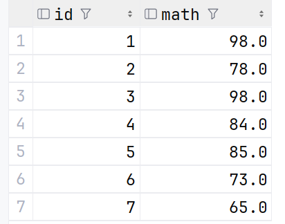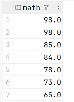 去重查询是通过关键字 distinct 来实现的,在之前的math中,是存在一个重复的98的,我们来试验一下去重查询操作: