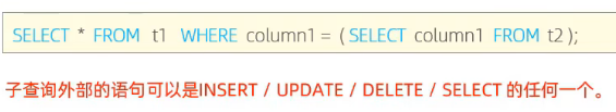 根据查询的结果又可以分为:标量子查询(查询结果为单个值),列子查询(查询结果为一列),行子查询(查询结果为一行),表子查询(查询结果为多行多列)
