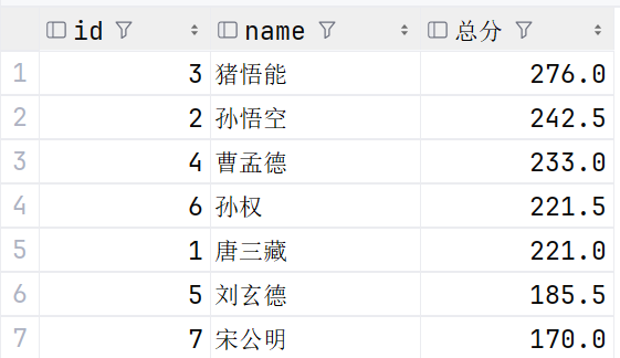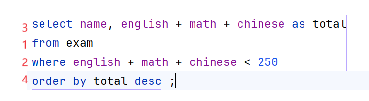 select id ,name, math + chinese + english as '总分' from exam order by math + chinese + english desc;前面已经定义了别名,所以后面可以直接用
