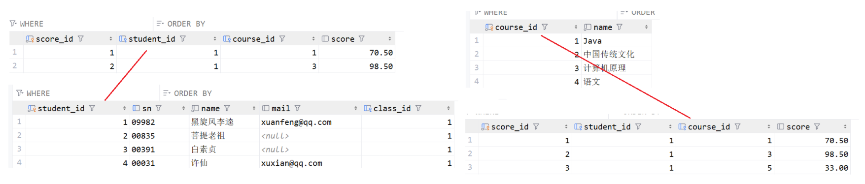 如果不用子查询,还是需要两步进行,获取课程的 id 之后,再根据 id 去查找成绩信息