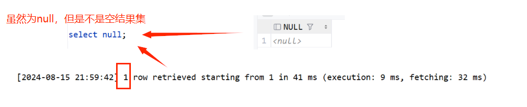 where exists(select null);对于上面的SQL语句,虽然exists中返回的是 null ,但不是空结果集,所以还会执行外层查询