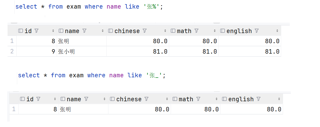 当用 '%' 表示的是找出姓张的人,任意字符也就是张后面可以跟任意个字符,'_' 表示单个字符,也就是张后面只能跟一个字符