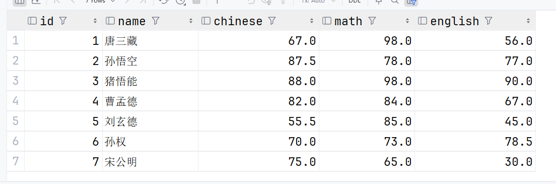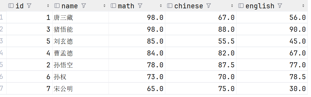 select id, name, math, chinese,english