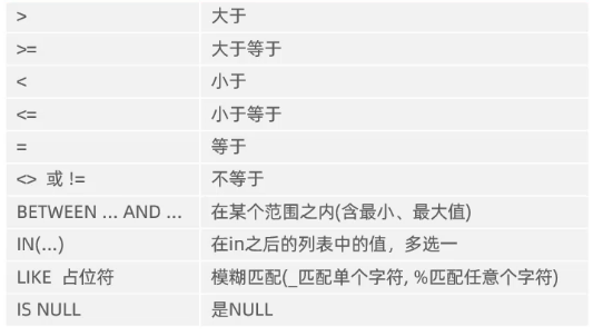 前面的大于等于这些符号和java中一样,就不多说了,而java中相等是用 "==" 表示的,mysql中是 "=" ,判断不等于的这两个写法都可以