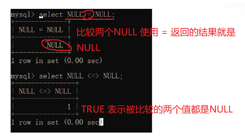 <=> | 表示等于,是专门针对null判断的,例如null <=> null 的结果为1 |