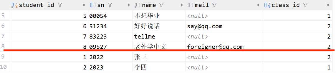insert into student2(student_id, sn, name, mail, class_id)