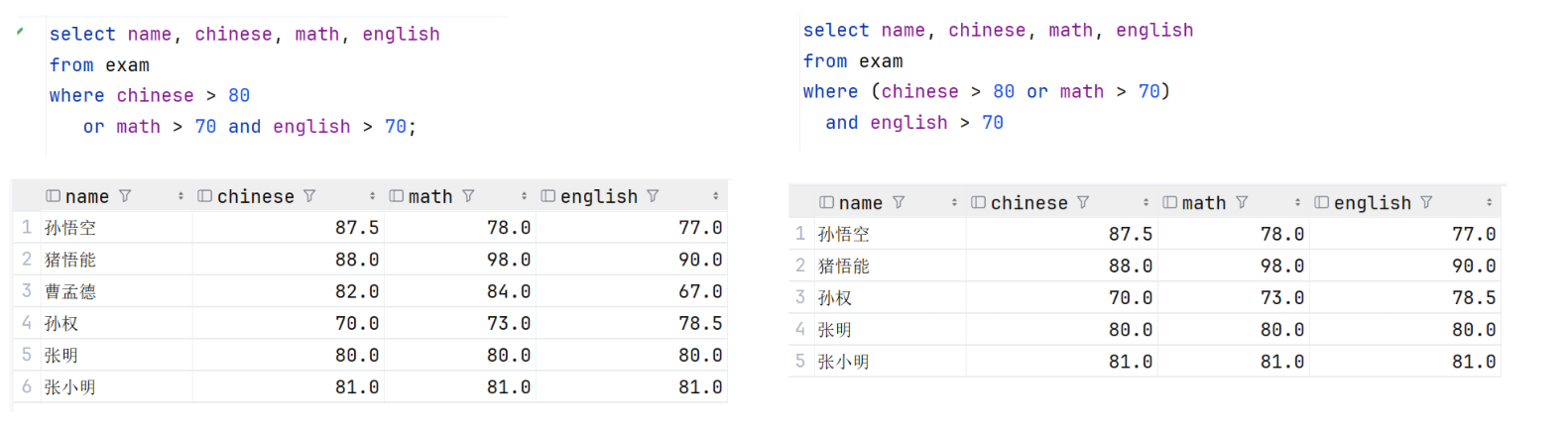 where (chinese > 80 or math > 70)
