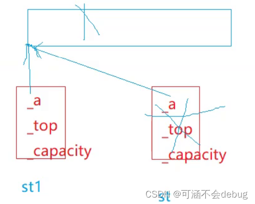 我们来分析一下,因为上面的函数是传值传参,而形参是实参的一份临时拷贝,所以本来st1中含有的_a空间,而st中也复制拷贝了一份,st中同样的_a也指向了相同动态开辟数组a的空间,而析构函数会自动清理动态开辟的空间,所以在fun2函数调用后会将动态开辟的a的空间释放,将其变成空指针,而在主函数调用后,也会调用析构函数,所以就会造成空间的二次释放!