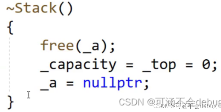 我们已经在上一章学习过了析构函数,析构函数的作用是处理动态开辟的空间,比如栈开辟的动态的空间。下图是栈的析构函数。
