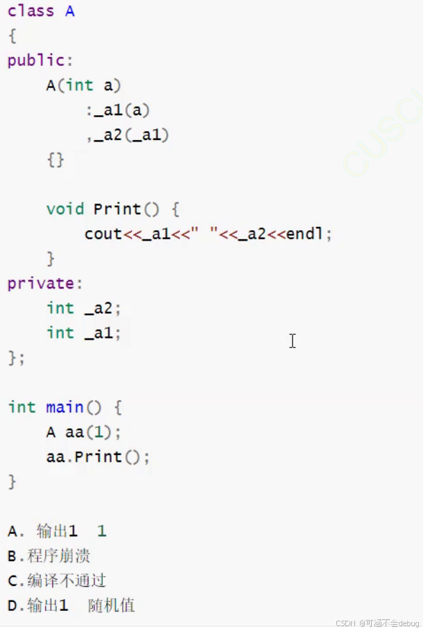 为什么不是两个1呢?因为初始化列表定义的顺序跟成员变量声明的顺序一致。在private中_a2是先声明,所以在初始化列表中先给_a2进行定义,因此就是随机值!!!