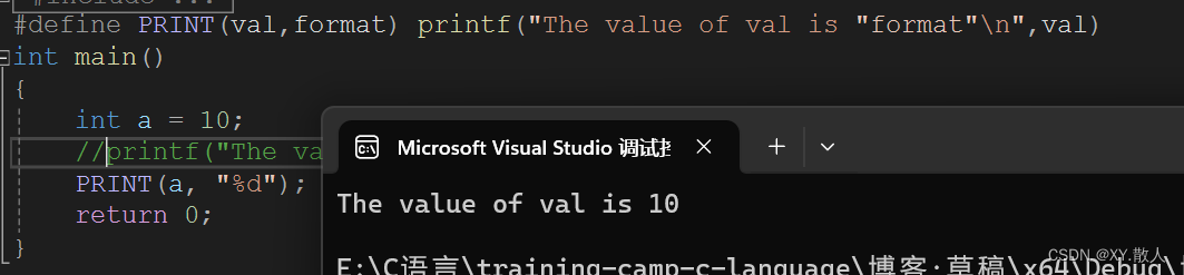 #define PRINT(val,format) printf("The value of " #val " is "format"\n",val)当我们做了如上修改之后,也就是单独给val领出来,加个#运算符,#a就会被替换成"a",这样就可以实现我们想要的功能了。