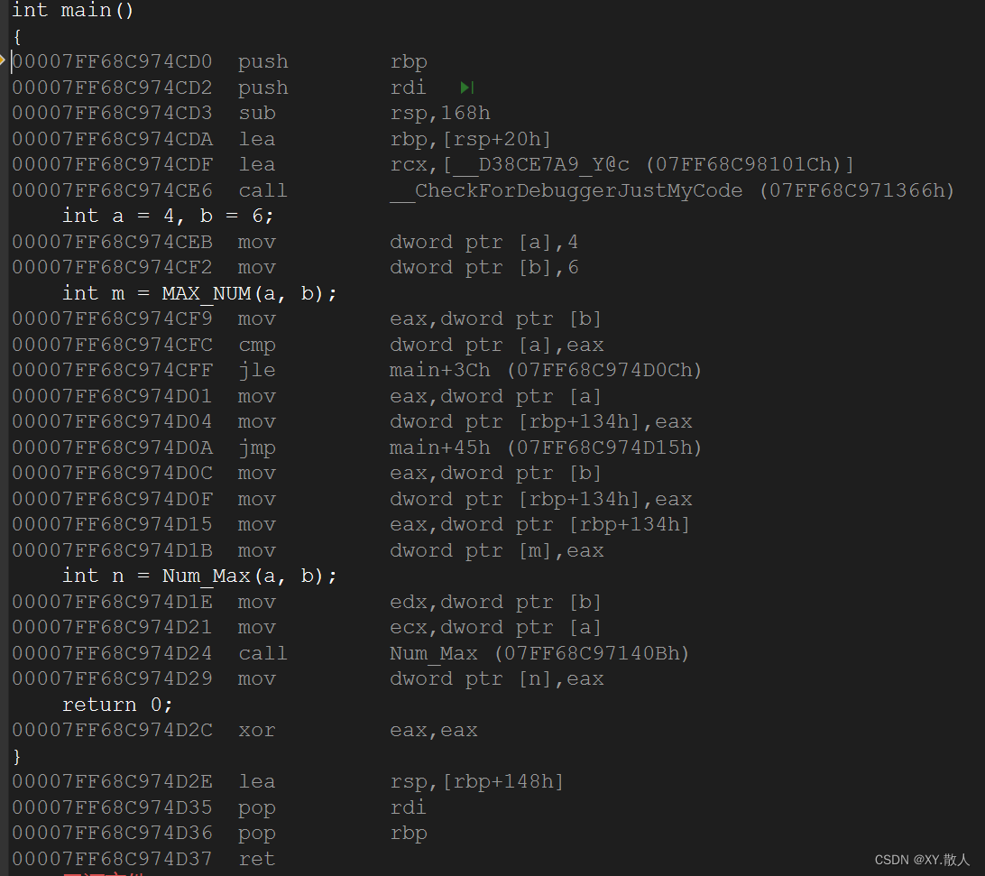 第二,函数创建的时候涉及到函数栈帧的创建,创建空间的时候需要压栈出栈,是比较浪费时间的,我们可以利用汇编指令看看: