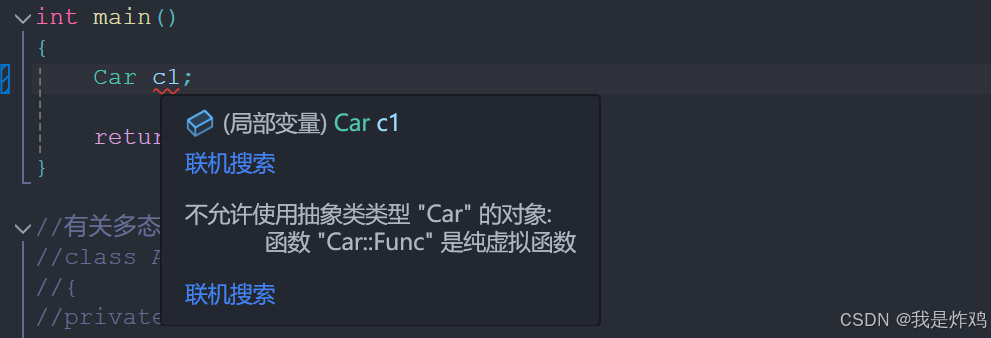 }所以继承了抽象类的派生类必须要重写虚函数,那么这里呢,我们就可以知道抽象类其实变相的相当于强制要求重写虚函数。这里和override是有些不同的,override是检查有没有重写,抽象类是强制要求重写,二者是有差别的。