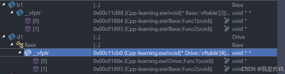 在地址打印出来后可以看到,派生类中没有被重写的虚函数,是放在Base1的虚表里面的,实际上就是谁先继承谁先放了。