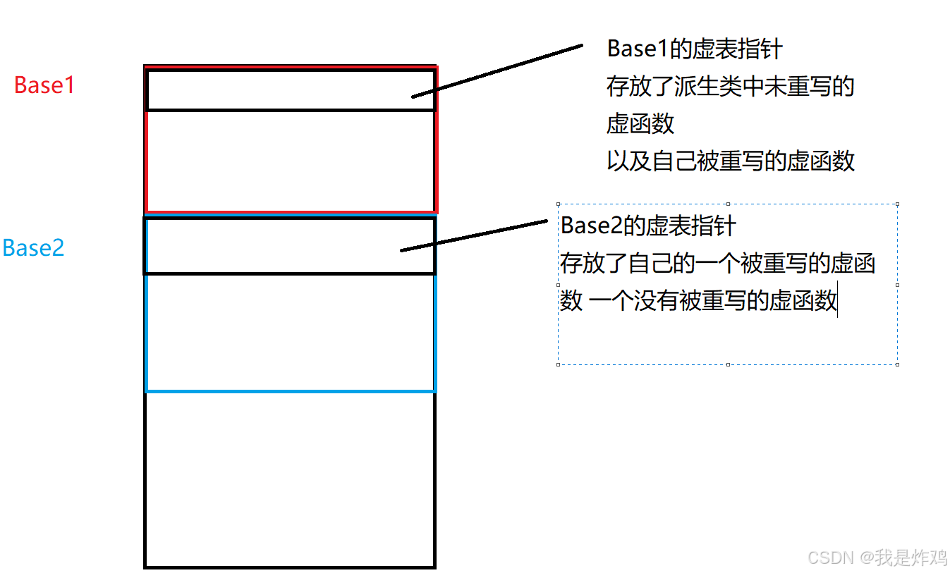 这里呢,是因为有两个虚表指针,一个存放在Base1 一个存放在Base2里面,有人问,为什么派生类里面没有虚表指针?