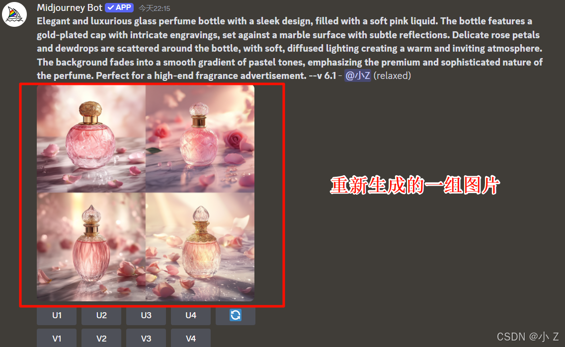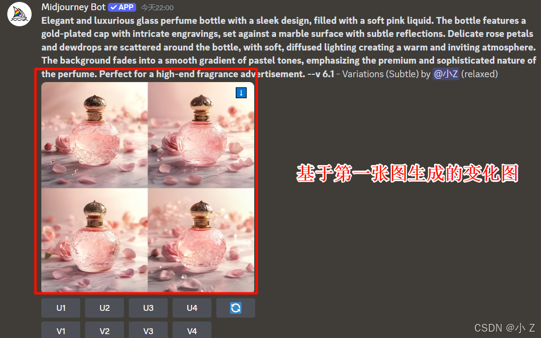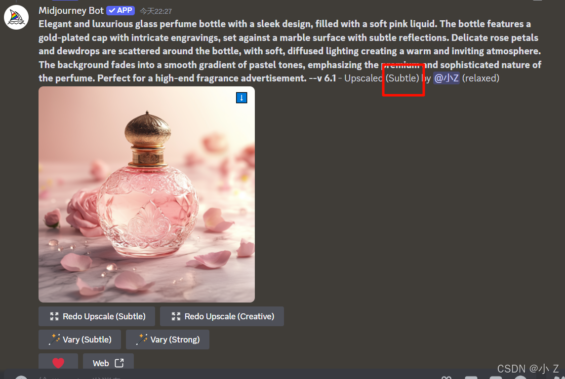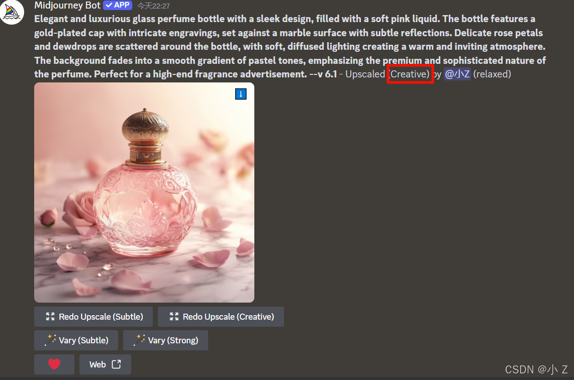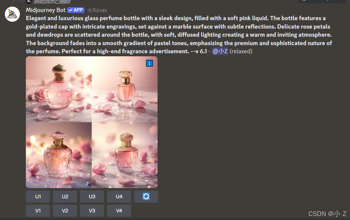 Elegant and luxurious glass perfume bottle with a sleek design, filled with a soft pink liquid. The bottle features a gold-plated cap with intricate engravings, set against a marble surface with subtle reflections. Delicate rose petals and dewdrops are scattered around the bottle, with soft, diffused lighting creating a warm and inviting atmosphere. The background fades into a smooth gradient of pastel tones, emphasizing the premium and sophisticated nature of the perfume. Perfect for a high-end fragrance advertisement./imagine命令,并以/imagine + prompt的形式向Midjourney传达了我们的需求,最终生成了一张香水静物图。