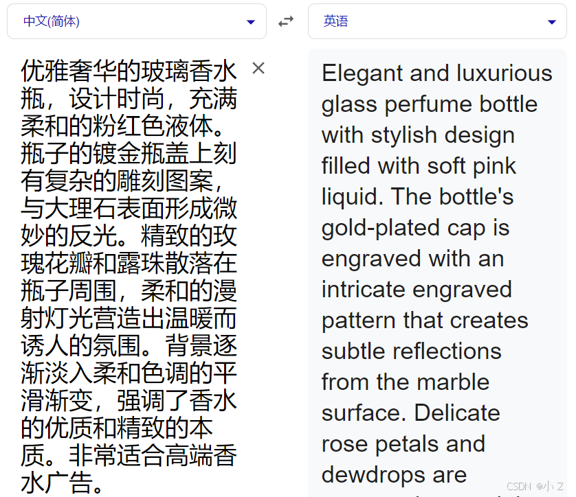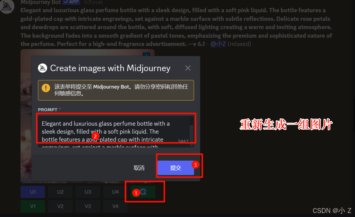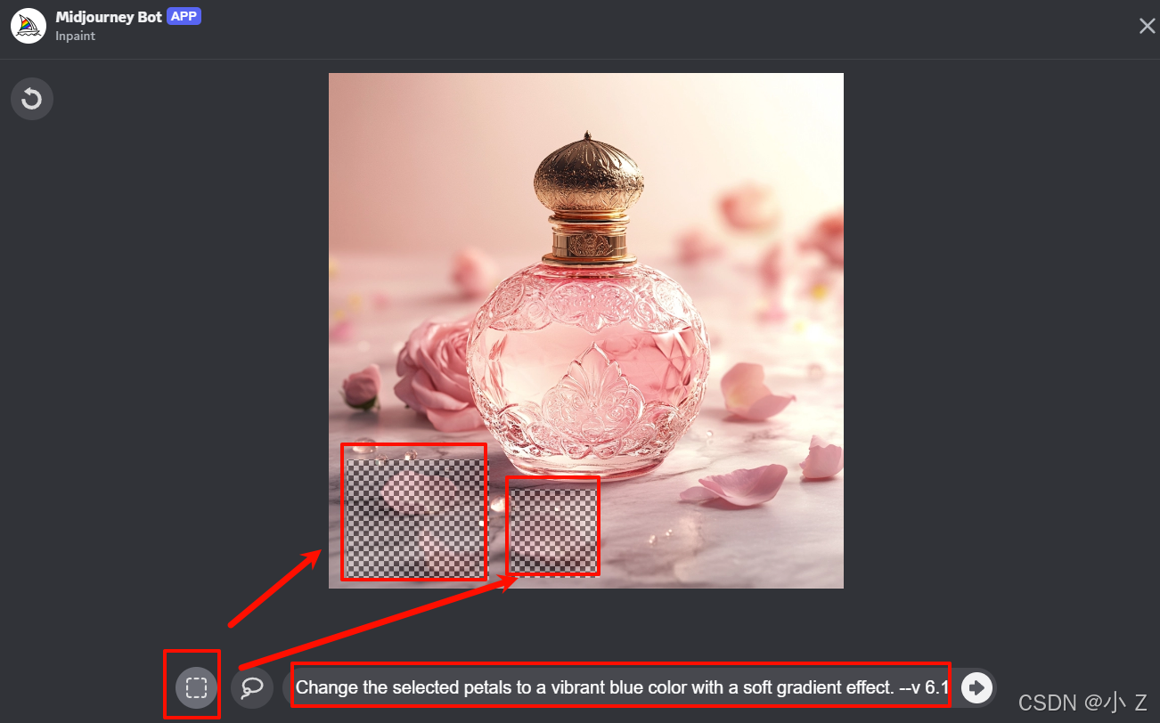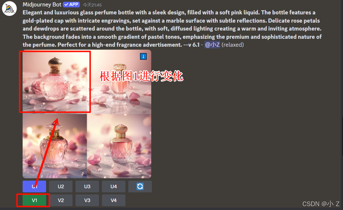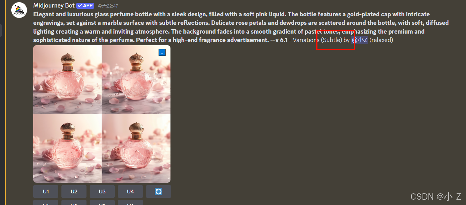 Elegant and luxurious glass perfume bottle with a sleek design, filled with a soft pink liquid. The bottle features a gold-plated cap with intricate engravings, set against a marble surface with subtle reflections. Delicate rose petals and dewdrops are scattered around the bottle, with soft, diffused lighting creating a warm and inviting atmosphere. The background fades into a smooth gradient of pastel tones, emphasizing the premium and sophisticated nature of the perfume. Perfect for a high-end fragrance advertisement./imagine命令,并以/imagine + prompt的形式向Midjourney传达了我们的需求,最终生成了一张香水静物图。