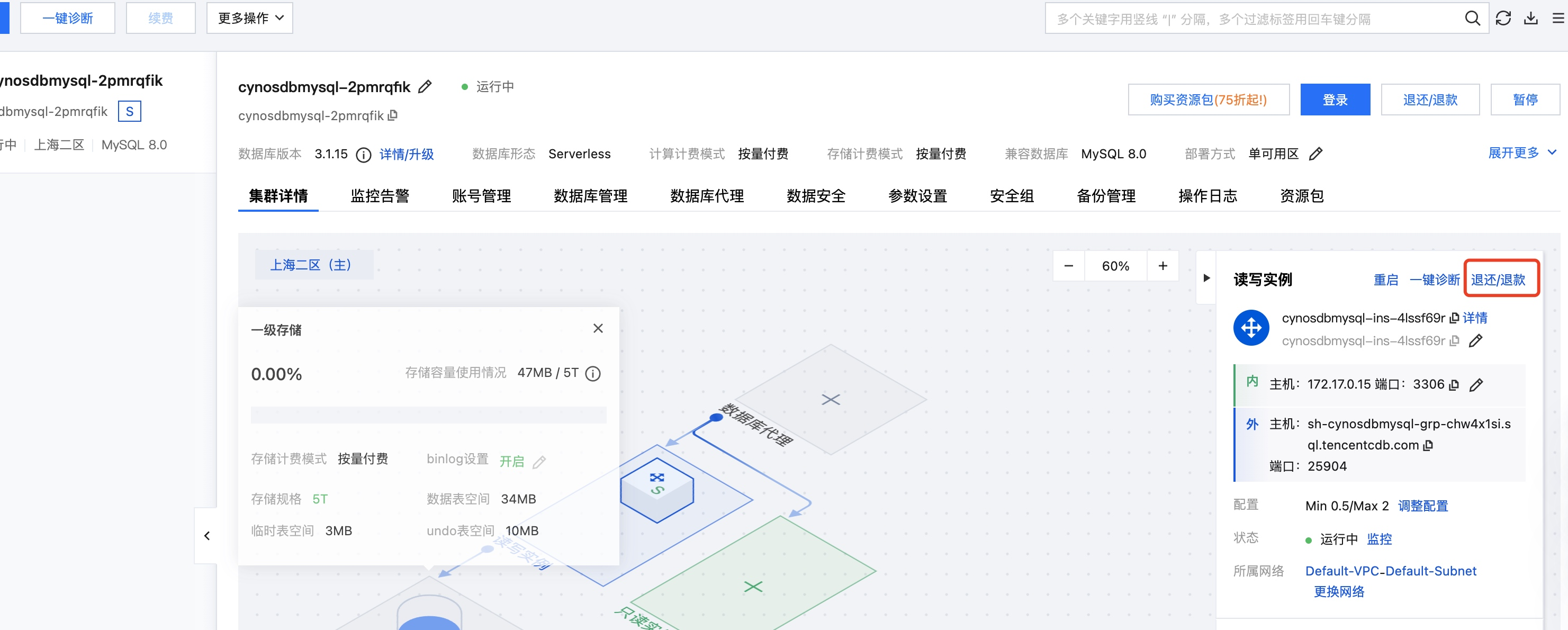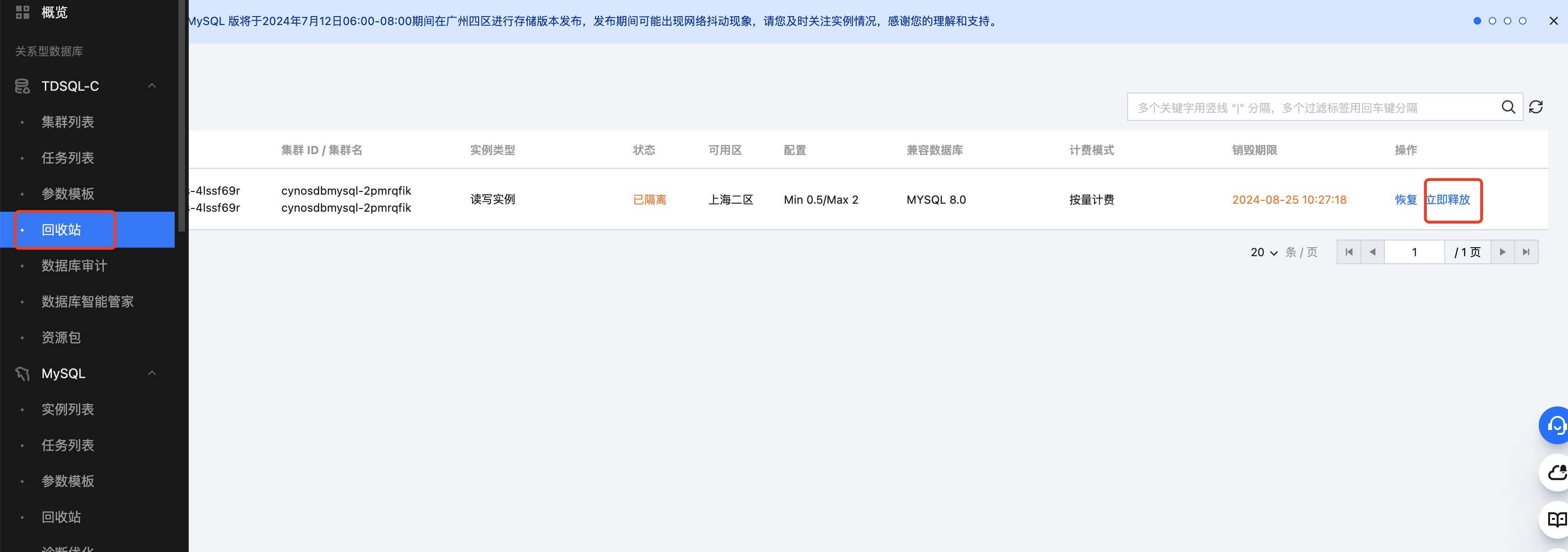 点击回收站即可看到已被退还的实例,为了数据安全,实例默认会在回收站中保留3天,如不需要可以进行立即释放
