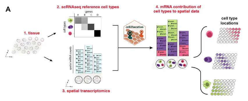 Cell2location 是一个用于空间转录组学数据分析的工具。它是一个基于贝叶斯统计模型的Python包,旨在利用空间转录组数据和单细胞转录组数据来进行细胞类型的空间解构。通过将单细胞转录组数据中的细胞类型信息投射到空间转录组数据中,Cell2location 可以估算不同细胞类型在空间位置中的丰度分布。