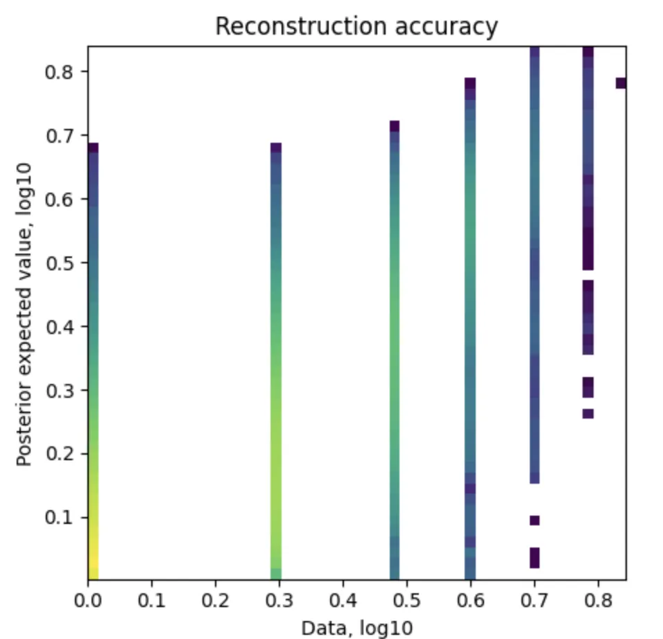 图中的点应该大致沿着对角线分布,这意味着模型的重构结果与原始数据接近,表示模型可以准确地重构基因表达值。如果点偏离对角线较多,则表示模型重构有较大的误差。