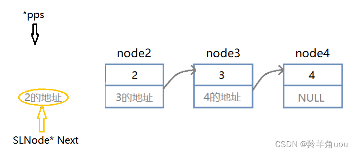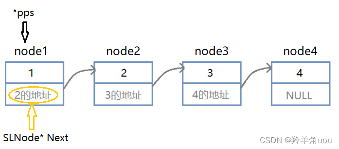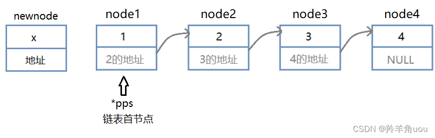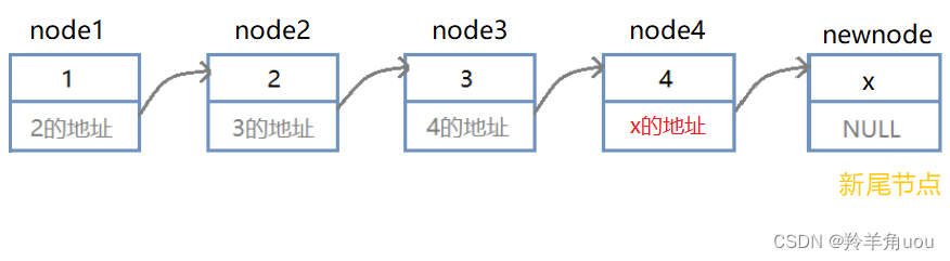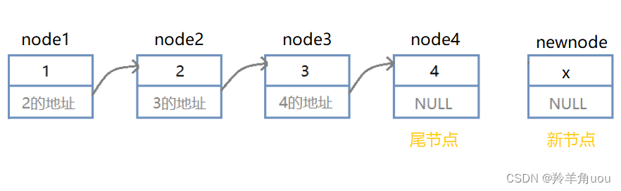 尾插要先找到尾节点,再将尾节点和新节点连接起来 ,此时node4的地址部分就不再是NULL 而是新节点的地址
